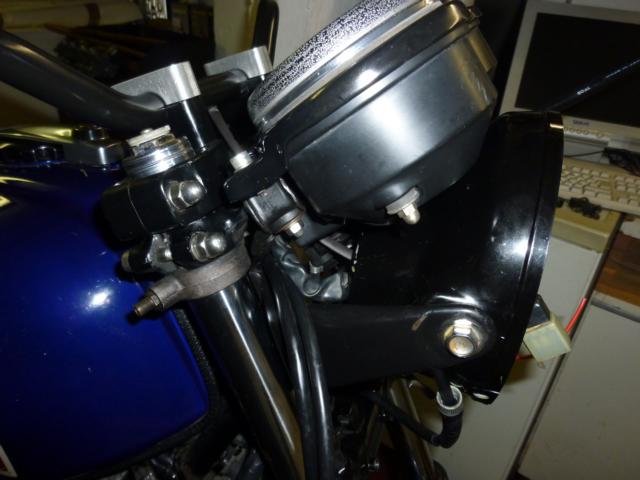 Ich habe die feinen Vibrationen, die die Maschine durch die direkte Motorverschraubung hat, doch unterschätzt. Erst fiel eine Schraube aus dem Zifferblatt vom Drehzahlmesser, dann riß das Zifferblatt vom Tacho durch, zum Schluß brach der Zeiger vom Tacho ab. Da ich mittlerweile Preise für die Instrumentenüberholung erfragt habe, suche ich doch lieber gebrauchte Instrumente. Bis dahin sind erst einmal funktionierende Uhren angebaut, die leider durch die verbeulten und verwitterten Bördelränder optisch nicht überzeugen. Den Armaturenträger habe ich zusätzlich mit Gummies unterlegt. Vielleicht halten die Instrumente nun länger.
