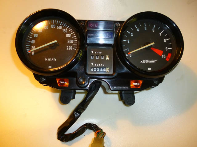 Das Cockpit entstand aus insgesamt drei Instrumenten neu. Kleine Schrammen am Oberteil habe ich mit 1000er Schleifpapier beigeschliffen und dann das gesamte Gehäuse poliert. Dem Unfallcockpit entstammt nur noch der Drehzahlmesser, Tacho und leider auch der Kilometerzähler waren zerbrochen. Daher hat die Maschine nun auch einen neuen Kilometerstand.