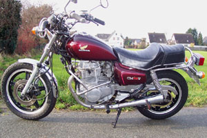 Hier nun die Beschreibung unserer 2. "Ehemaligen", einer schönen CM400T, Bj. 1980. Die Maschine hatte einen teilüberholtem Motor, neue Reifen, einen neuen Kettensatz und einem super Lacksatz in original rot-metallic mit fehlerfreier Sitzbank. Kilometerstand: ca. 61000km. Der Motor war allerdings ein Tauschmotor, Typ CB400TE, auch mit 5-Gang-Getriebe, Kilometerstand unbekannt. Das Getriebe ließ sich allerdings butterweich und exakt schalten und es ist auch kein Steuerkettenrasseln oder so zu hören. Die Maschine hatte eine offene Nockenwelle mit 43 PS eingebaut.